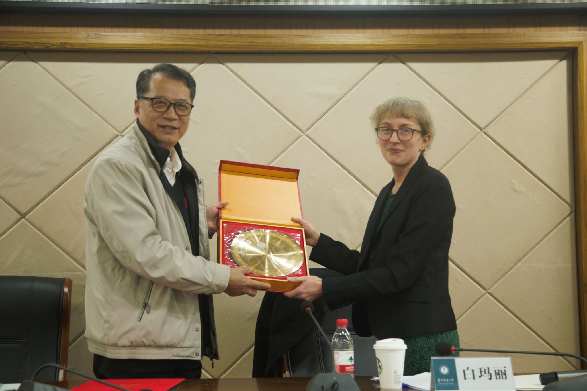 图为12月11日彭南生教授向白玛丽教授赠予章开沅学术讲座纪念品。黄婉晴摄。